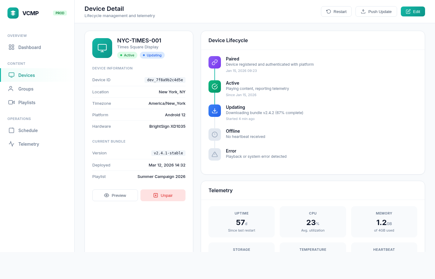 VCMP devices operate on a pull-based model. Devices check for updates on their own heartbeat cycle, download signed bundles, verify integrity, and play content. No push. No drift.