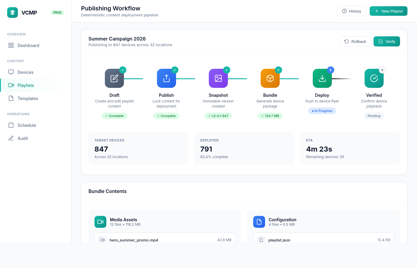 Forget push-based chaos. VCMP uses deterministic publishing where content is versioned, signed, and pulled by devices on their own schedule.